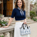Interwoven with the floral designs are graceful doves and hummingbirds, embodying peace and the spirit of divine connection. The refined monochrome palette of deep blue on a pristine white background enhances the bag's sophistication and adds a touch of classic elegance.