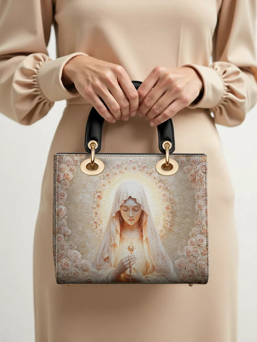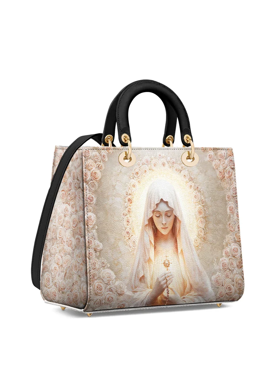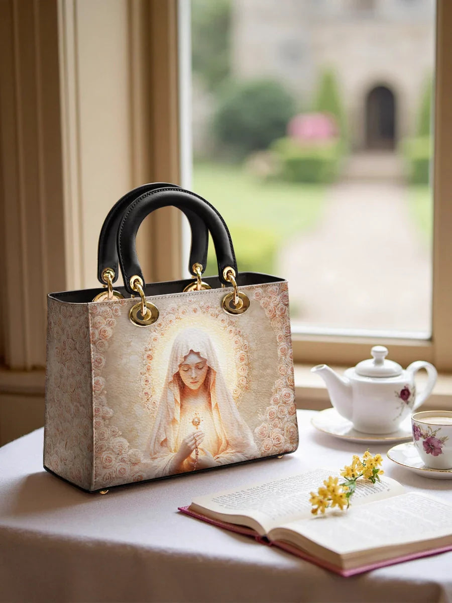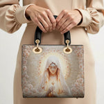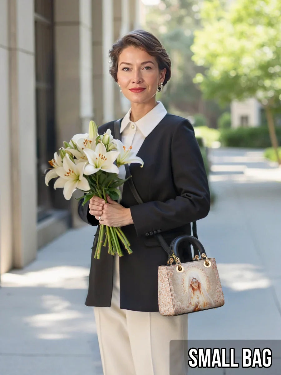 This exquisite leather bag radiates serenity and devotion, featuring a breathtaking image of the Virgin Mary holding the Holy Eucharist and rosary. Encircled by a luminous halo of soft pink roses, the artwork symbolizes purity, faith, and divine love. The delicate rose accents blend seamlessly with the serene ivory and gold tones of the design, creating a masterpiece of elegance and spirituality.