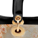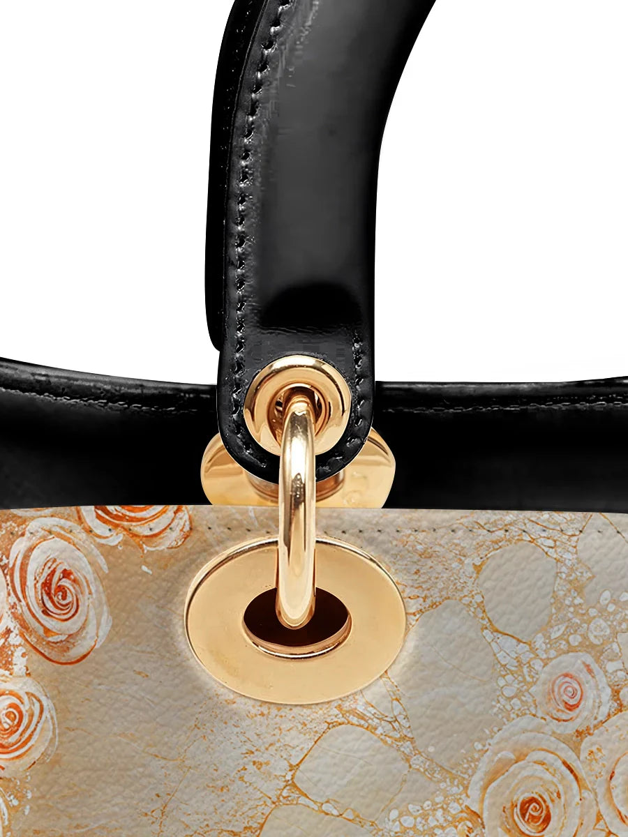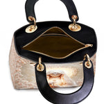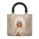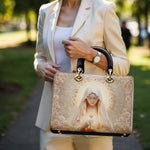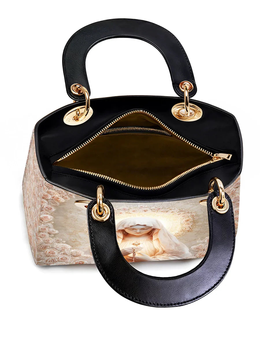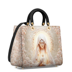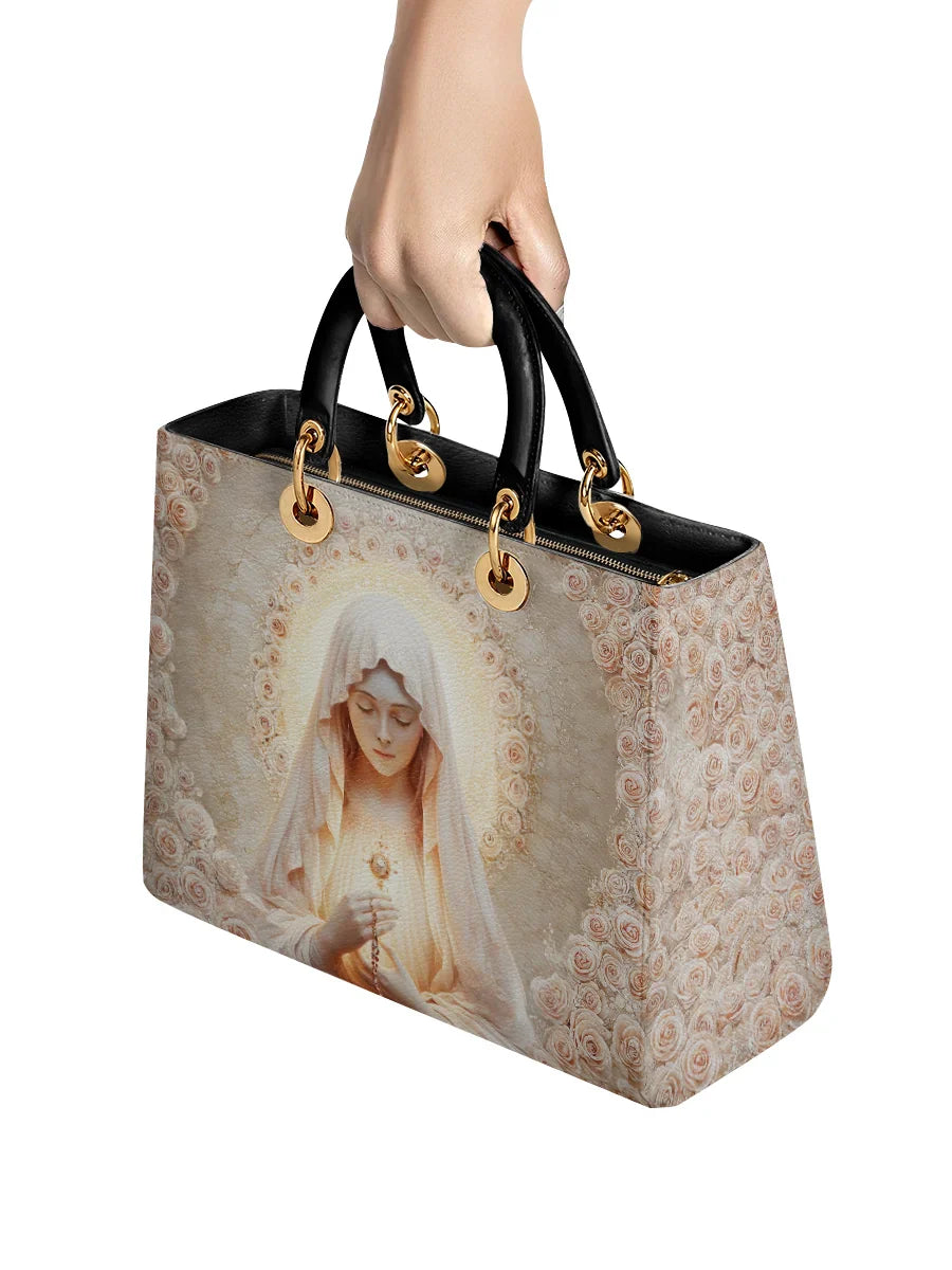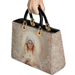 This exquisite leather bag radiates serenity and devotion, featuring a breathtaking image of the Virgin Mary holding the Holy Eucharist and rosary. Encircled by a luminous halo of soft pink roses, the artwork symbolizes purity, faith, and divine love. The delicate rose accents blend seamlessly with the serene ivory and gold tones of the design, creating a masterpiece of elegance and spirituality.