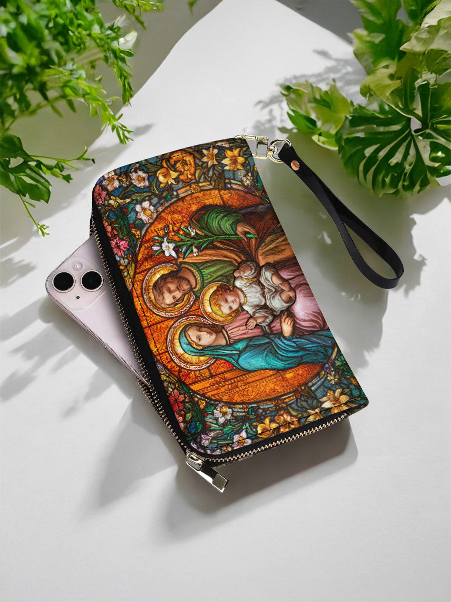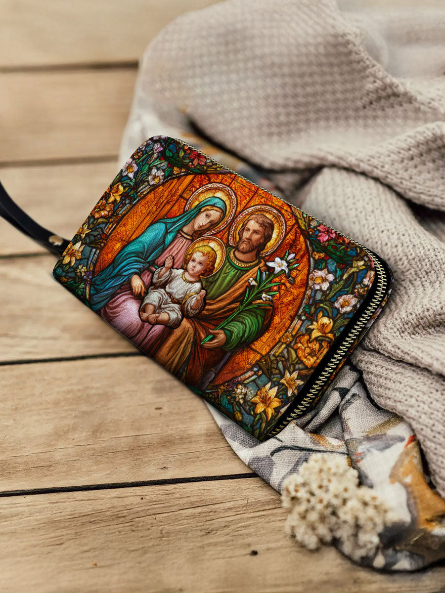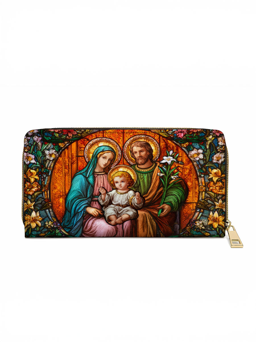 This wallet portrays the Holy Family — Mary, Joseph, and the Child Jesus — surrounded by blooming lilies and radiant light. A symbol of love, unity, and divine protection, it inspires devotion in daily life.