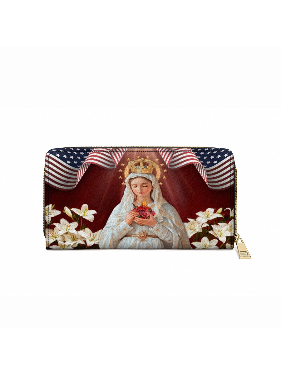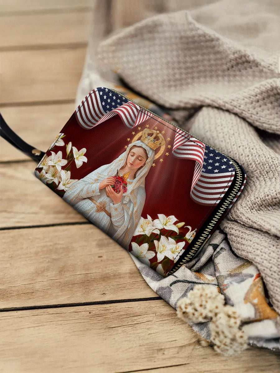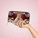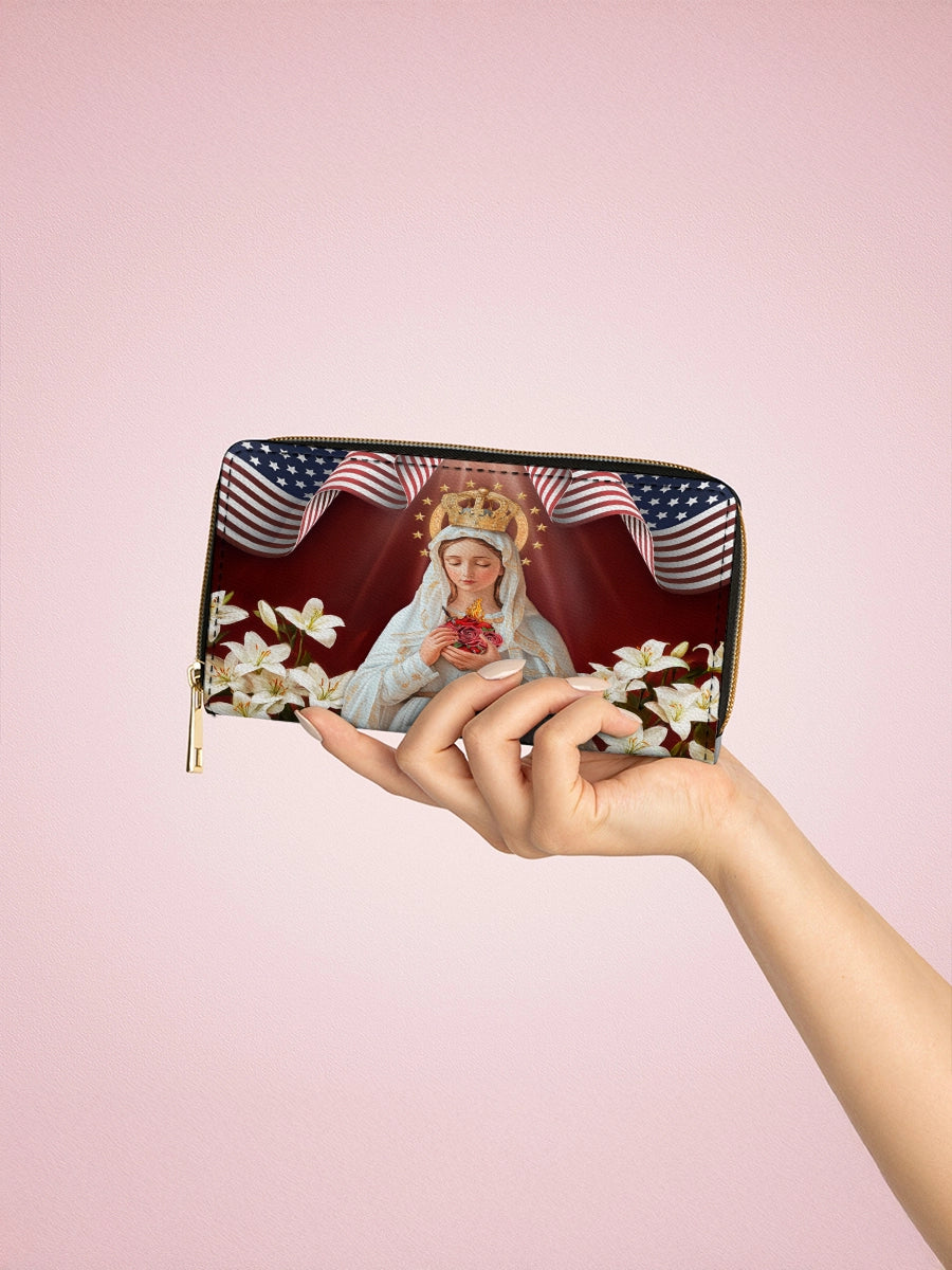The "Our Lady of America" handbag beautifully merges faith and fashion, featuring a serene depiction of the Blessed Virgin Mary crowned in glory, holding the flaming Sacred Heart encircled by roses. Draped behind her, the American flag evokes a sense of devotion, patriotism, and divine protection.