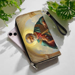 Ce portefeuille magnifiquement conçu rend hommage à Saint Pierre, représenté avec les clés du royaume des cieux et les Saintes Écritures. Ses robes vibrantes et son halo lumineux symbolisent son rôle central dans l'Église et sa dévotion à la mission du Christ. Les détails complexes et les couleurs riches évoquent la sagesse, la foi et l'autorité divine, faisant de ce portefeuille une expression significative de dévotion spirituelle.