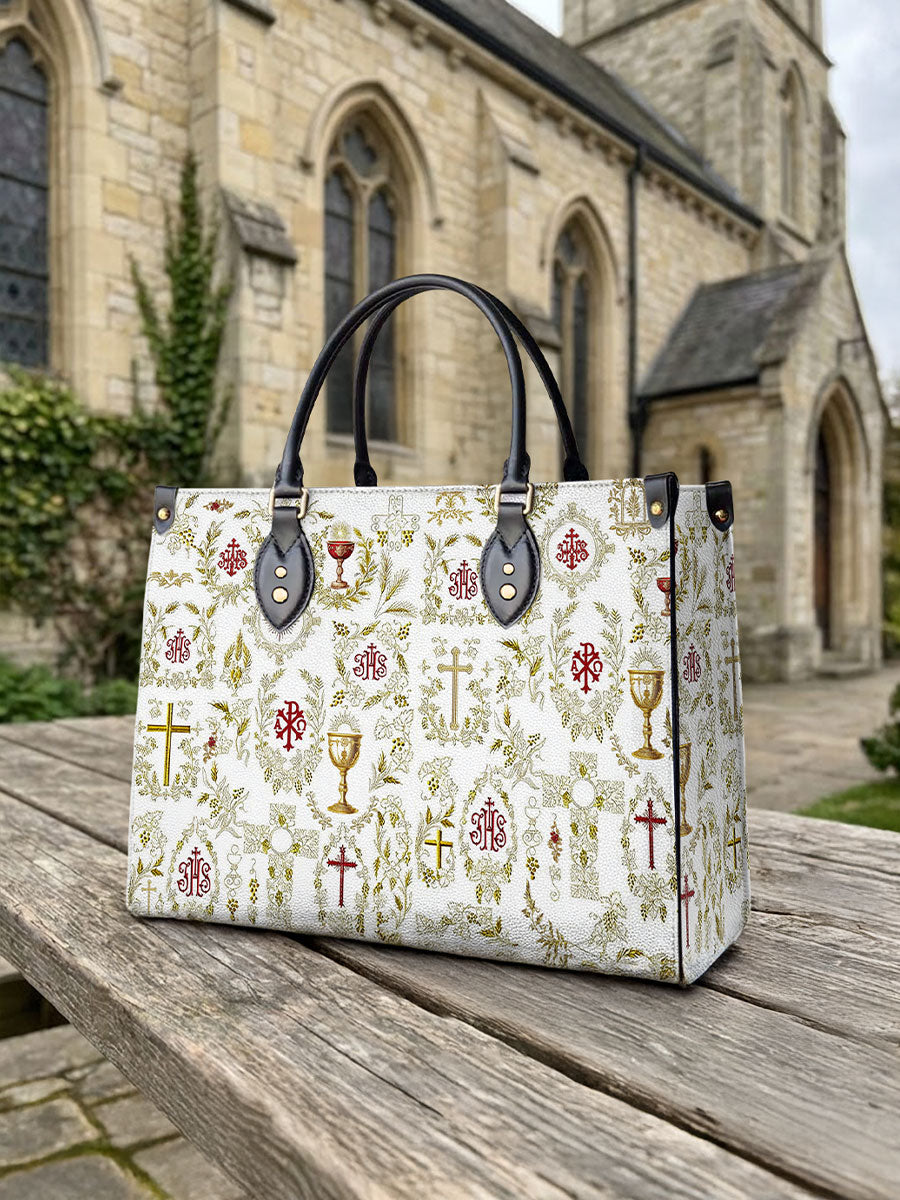 This elegant leather bag features a refined and intricate pattern of sacred Christian symbols, including the cross, chalice, Eucharistic host, and holy monograms. Each emblem is beautifully adorned with golden accents and surrounded by delicate floral and vine motifs, symbolizing the richness and depth of the Catholic faith. The harmonious combination of white, gold, and deep red creates a timeless and reverent design, celebrating the sacred mysteries and the beauty of devotion.